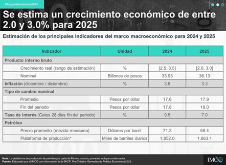 La política fiscal del sector público federal está estrechamente vinculada al comportamiento de distintas variables macroeconómicas, por lo que es importante que las estimaciones que utiliza la SHCP en los PCGPE 2025 para pronosticar los ingresos, gasto y deuda del siguiente ejercicio fiscal se cumplan, especialmente en lo que respecta al producto interno bruto (PIB) y otras variables como el tipo de cambio, la tasa de interés, y el precio y plataforma de producción de petróleo crudo.