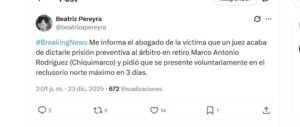 A través de redes sociales, la periodista difundió que el abogado de la víctima confirmó que el ex árbitro de la Federación Mexicana de Futbol (FMF) debe presentarse ante de las autoridades. “Me informa el abogado de la víctima que un juez acaba de dictarle prisión preventiva al árbitro en retiro Marco Antonio Rodríguez (Chiquimarco) y pidió que se presente voluntariamente en el reclusorio norte máximo en 3 días”, publicó.