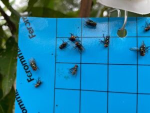 Como parte de la estrategia integral, el personal técnico instaló trampas en puntos estratégicos del rancho, con el objetivo de reducir de manera significativa la presencia del insecto y, con ello, disminuir casos de miasis y proteger la sanidad del hato.