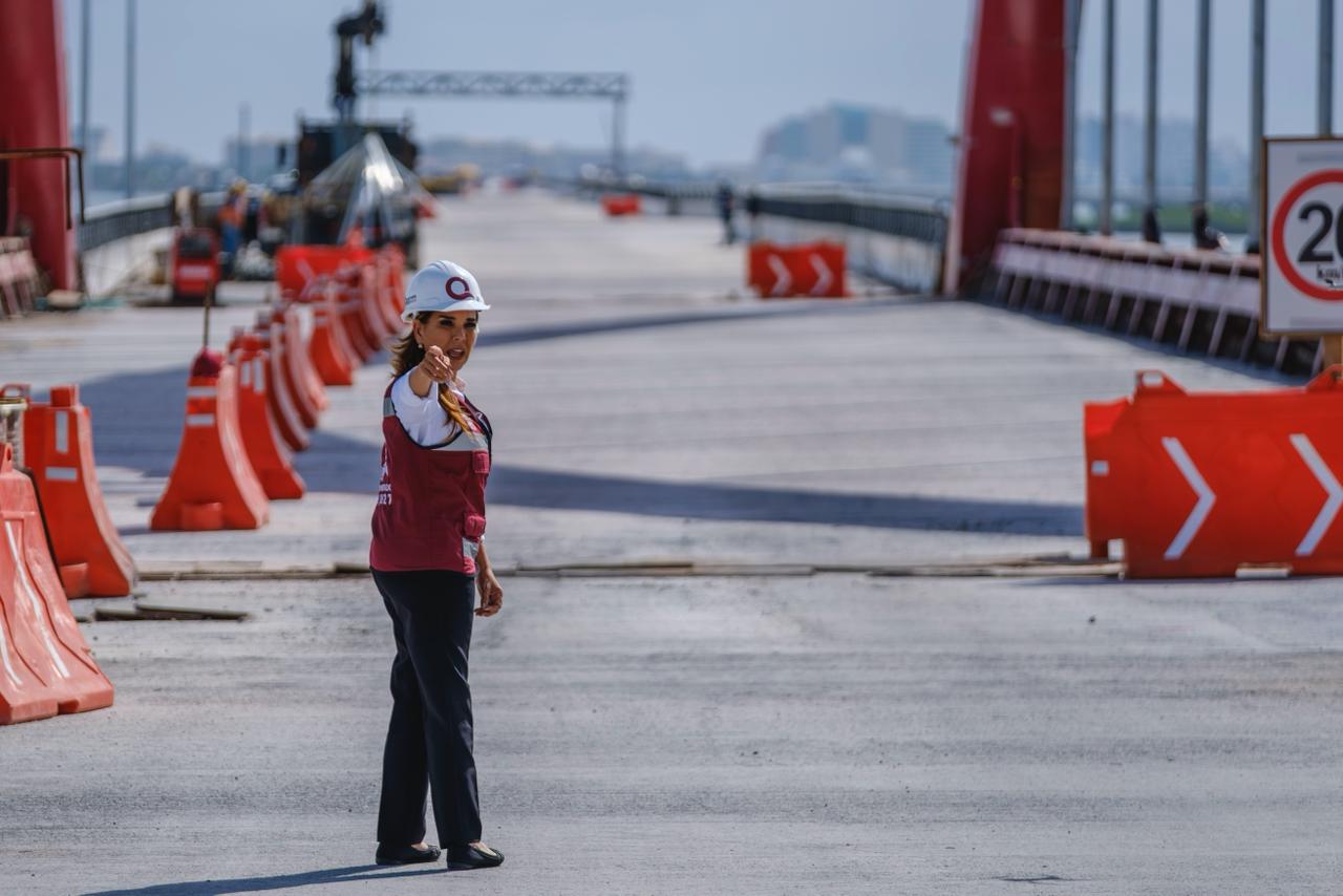 La Gobernadora explicó que el Puente Nichupté registra un avance del 98.5 por ciento en el entronque Colosio, 98.3 por ciento en la zona terrestre, 95.6 por ciento en el gran arco metálico, 91.8 por ciento en la zona lagunar y 79.3 por ciento en el entronque del bulevar Kukulcán.