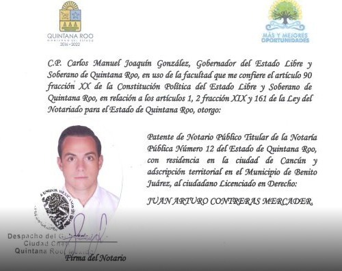 A cuatro días de concluir la administración de Carlos Joaquín González como gobernador de Quintana Roo, le otorgaron la patente como Notario Público No. 12 de Cancún a Juan Arturo “N”, quien presuntamente también está vinculado a la empresa RAMCO Servicios Integrales SA de CV a la que el H. Ayuntamiento de Puerto Morelos, que preside Blanca Merari Tziu Muñoz, le otorgó en un día tres contratos por un monto de $20 millones 395 mil 343.97 pesos.