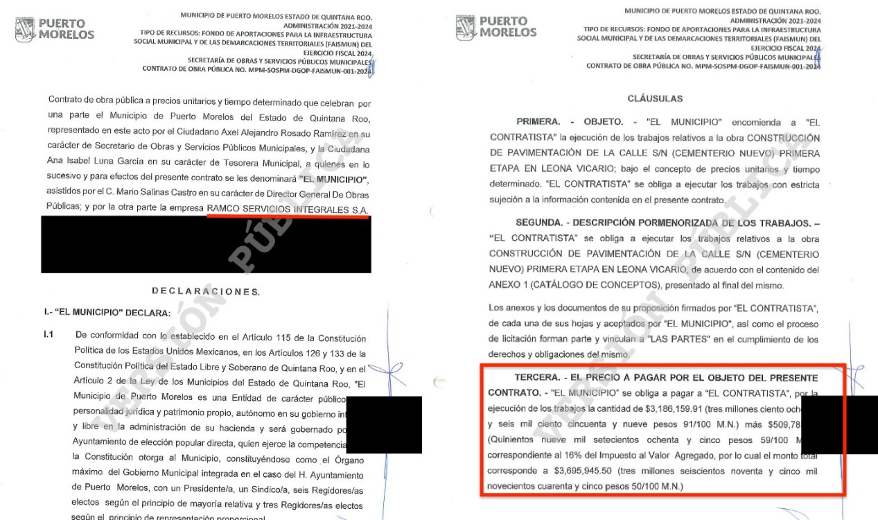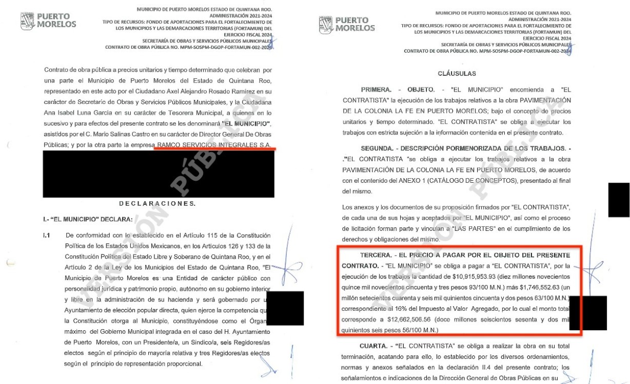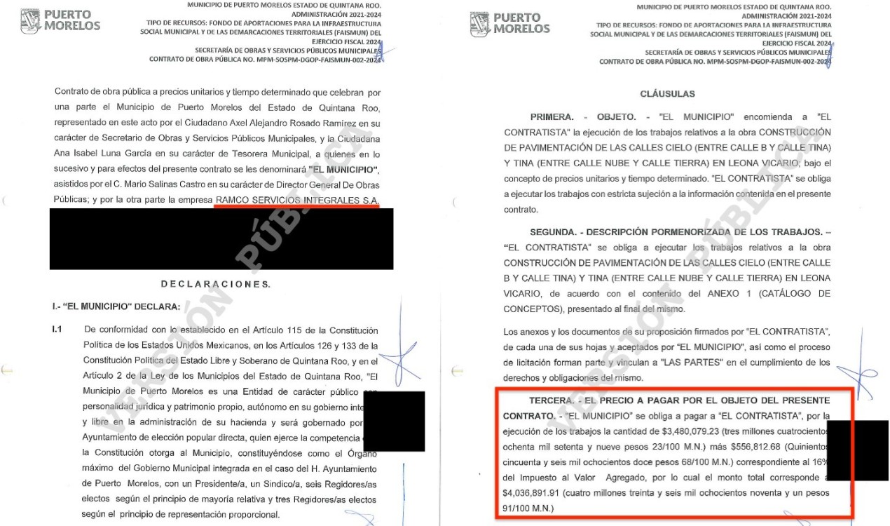 El primer contrato fue el MPM-SOSPM-DGOP-FORTAMUN-002-2024 para la construcción de banquetas y guarniciones en las calles 1, 2, 3 y 4 de la colonia La Fe, en Puerto Morelos, que pese a que se trataba de una licitación pública de carácter nacional, extrañamente solo la empresa RAMCO Servicios Integrales fue la única que presentó propuesta técnica y económica, por lo que los funcionarios responsables del concurso como Mario Salinas Castro, secretario del comité y director general de obras públicas, y el propio Axel Alejandro Rosado Ramírez, le adjudicaron el fallo y la obra por un monto de $12 millones 662 mil 506.56 pesos.