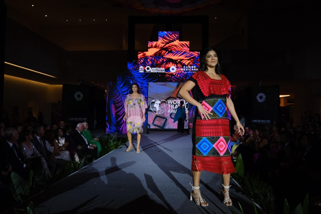 Ante el presidente y fundador de los World Travel Awards, Graham Cooke, artesanas y artesanos de comunidades mayas lucen en pasarela sus prendas que son orgullo mundial e imponen moda