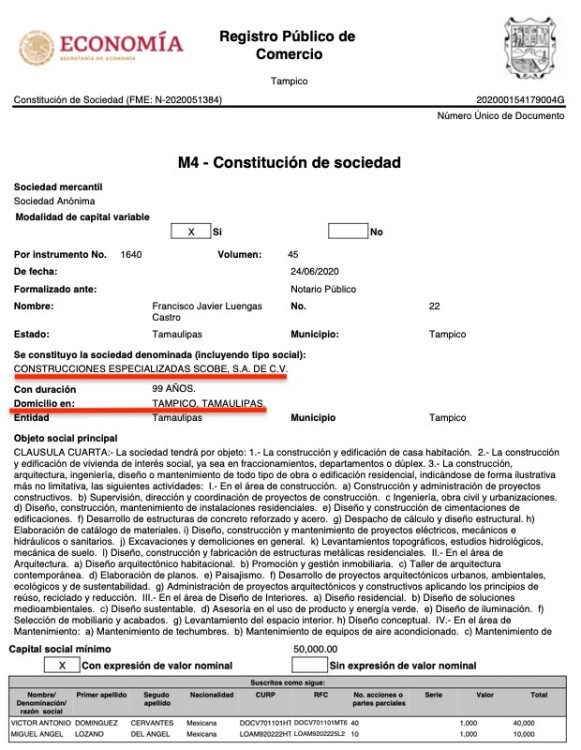 Construcciones Especializadas SCOBE SA de CV, también de Tampico, Tamaulipas, que ganó el contrato LOPN-IFEQROO-FAM-010-2024 para construcción de la secundaria de nueva creación, Fraccionamiento Aldea Tulum (Edificio C) por un monto de $7,409,842.8 pesos.