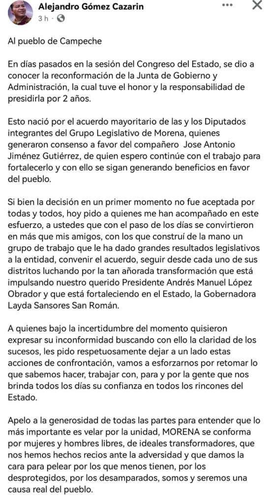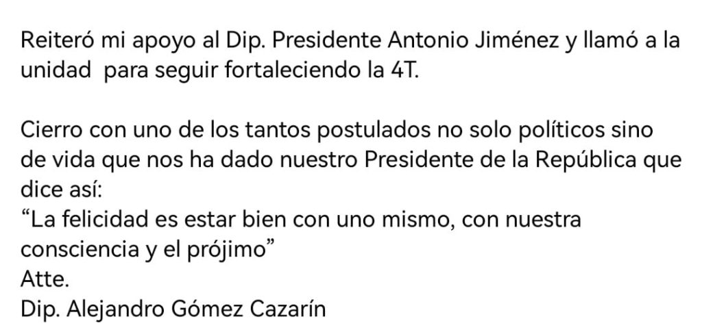 Alejandro Gómez Cazarín quien hasta hace algunos días era Presidente de la Junta de Gobierno y Administración del Congreso del Estado, rompió el silencio. Lo hizo a través de sus redes sociales en donde público un carta y llamo a la unidad.