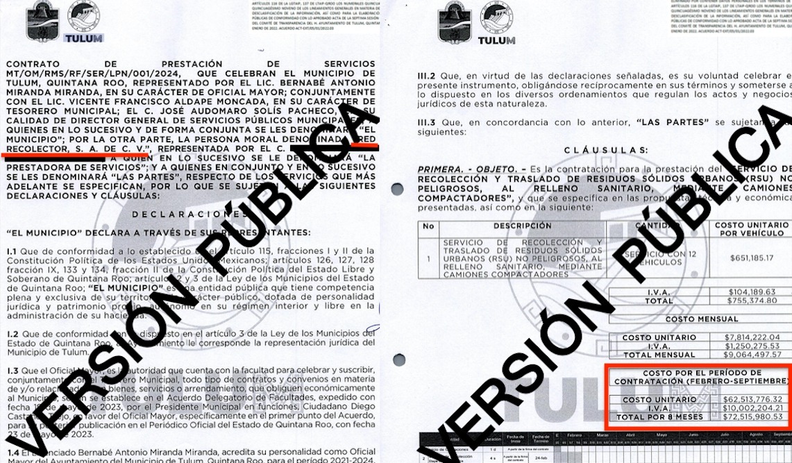 El pasado 26 de enero de 2024, Red Recolector SA de CV (Red Ambiental), una empresa presuntamente relacionada con Jorge Emilio González Martínez ‘Niño Verde’, extendió sus negocios al municipio de Tulum, que preside el ‘morenista’ Diego Castañón Trejo, donde obtuvo el contrato para la recolección y traslado de residuos sólidos urbanos al relleno sanitario, mediante 12 camiones compactadores, por un monto de 72 millones 515 mil 980.53 pesos.
