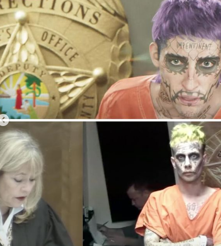 - Luego continuamos con un juicio. En el vídeo vemos como un hombre lleno de tatuajes y el cabello pintado de un color llamativo es procesado ante la ley. En realidad ese caso si ocurrió. El personaje del juego es quien tiene el cabello morado.
