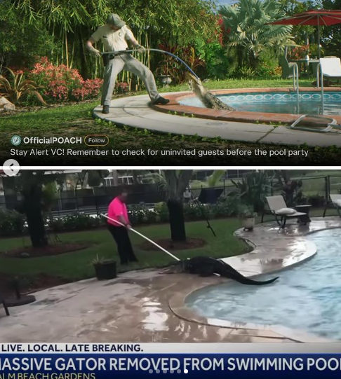 - Terminamos con el cocodrilo en la alberca. Creemos que está es la más parecida a la vida real pues ambas escenas son casi idénticas. El contexto es simplemente como el título indica, un cocodrilo decidio entrar en la alberca de una casa y tuvieron que sacarlo a la fuerza.