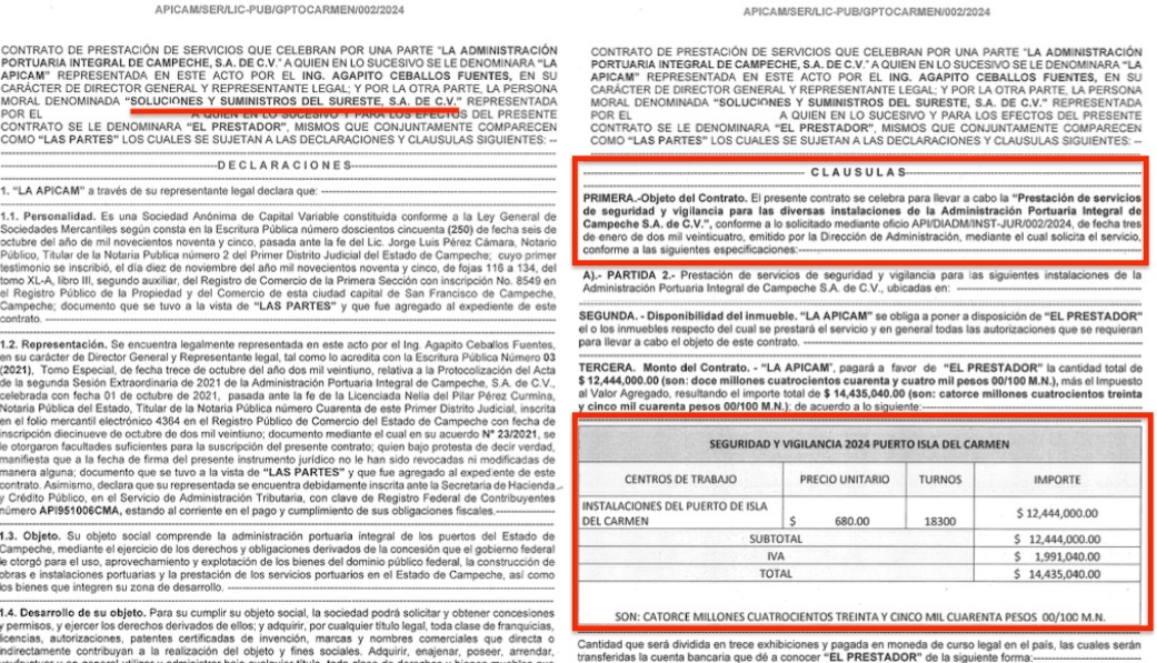 Llama la atención, que entre los objetos sociales de la empresa Soluciones y Suministros del Sureste no aparecen los servicios de seguridad privada o de vigilancia, pese a ello Agapito Ceballos Fuentes, Director General de la APICAM, avaló con su firma la entrega del contrato APICAM/SER/LIC-PUB/GPTOCARMEN/002/2024.