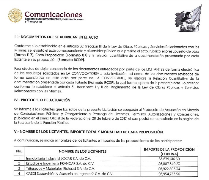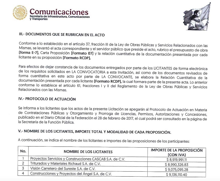 De acuerdo con la apertura de propuestas, son cuatro empresas las que buscan los servicios: Inmobiliaria Industrial JOCAR SA de CV, de José Abelardo López Osuna, que ofertó por los trabajos la suma de $6,679,6161.50 pesos; Estudios e Ingeniería FRANCAR SA de CV, de Luis Carlos Mendoza Hernández, $6,887,549.23 pesos; Triturados y Materiales Richaud SA de CV, de Antonio José Richaud Flores ( a través de Brenda Alicia Conchillos Mendoza), $6,922,803.34 pesos; y CASDI Supervisión y Asesoría en Ingeniería SA de CV, de Fernanda Shecire Ojeda Ramayo, Alejandro de Jesús Moo Vázquez y Geny Irene Ku Balan, $6,954,753.56 pesos.