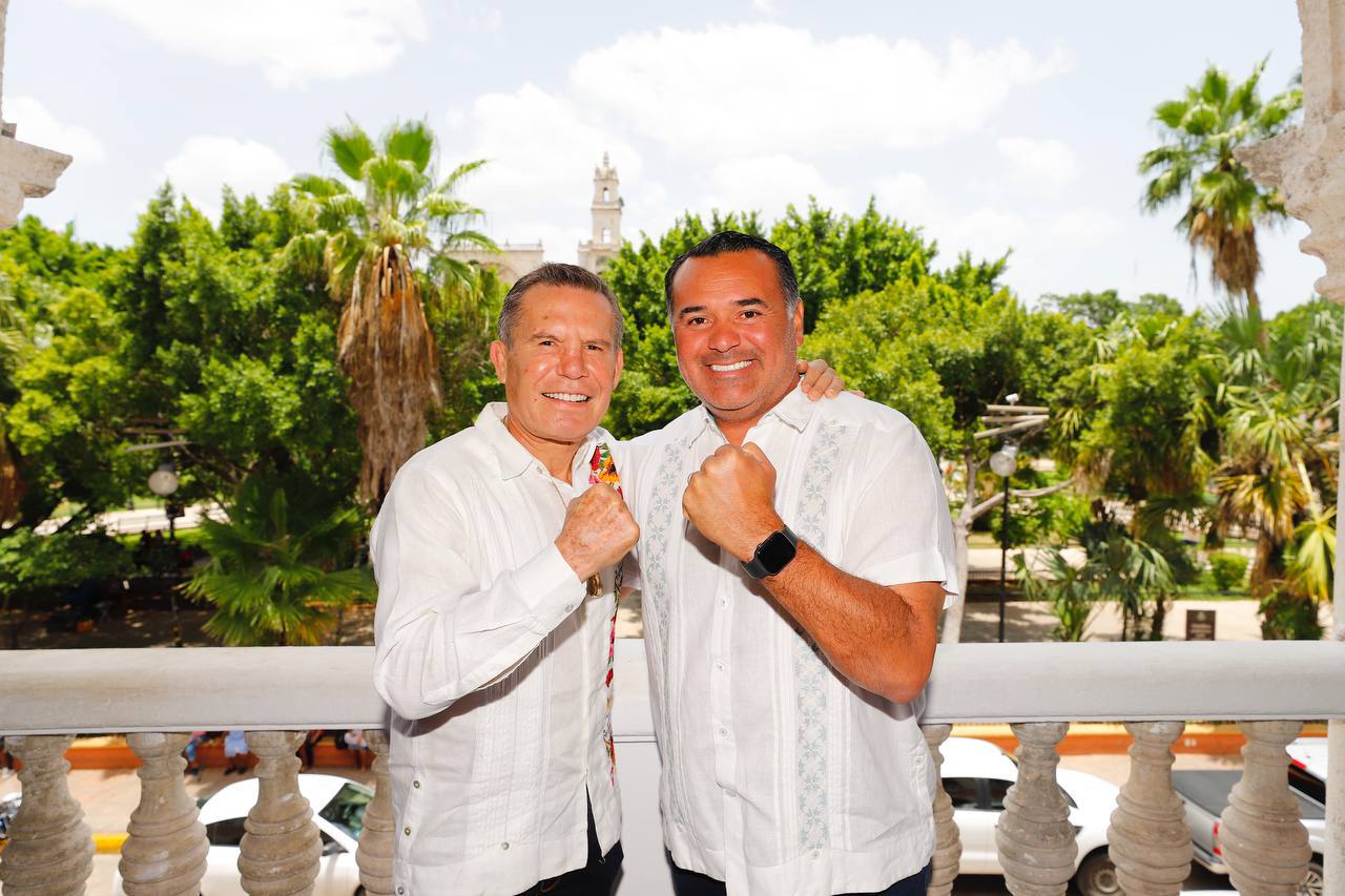Como primer punto de la agenda de trabajo, estuvo la reunión que sostuvieron en el Salón de Cabildo “Rosa Torre González”, donde el Presidente Municipal recibió e intercambió puntos de vista sobre el fomento deportivo con Julio César Chávez, quien es un referente del boxeo para México, especialmente para Mérida y Yucatán de donde han emergido otros grandes campeones mundiales como Miguel Ángel Canto Solís, Freddie Castillo Martínez, “El Chato” y Gustavo Hernán Espadas Cruz.