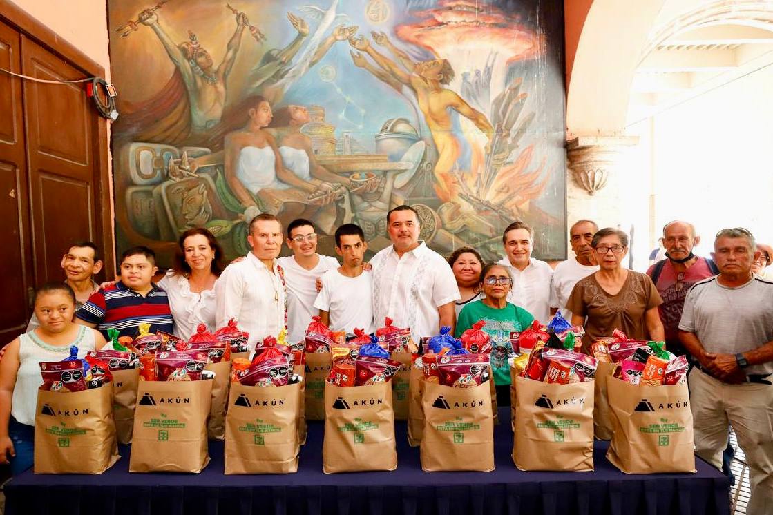 Como parte de las actividades, en los bajos del Palacio Municipal el ex campeón mundial hizo entrega de 20 despensas para que al Ayuntamiento a través del DIF Mérida las canalice a las familias más vulnerables.