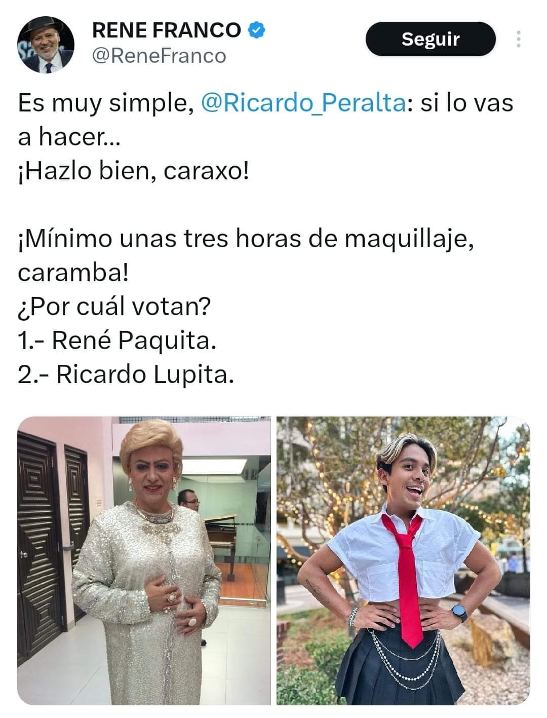 “Es muy simple, Ricardo Peralta: si lo vas a hacer… ¡Hazlo bien, caraxo! ¡Mínimo unas tres horas de maquillaje, caramba! ¿Por cuál votan? 1.- René Paquita. 2.- Ricardo Lupita”, puntualizó.