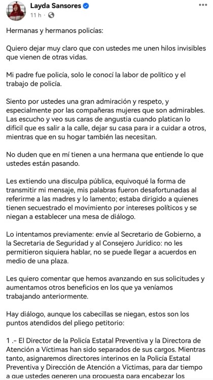 La Gobernadora emitió un mensaje a través de sus redes sociales, el cual se replicó rápidamente ante la falta de cumplimiento a exigencias. Y es que si bien se dio de baja a uno de los principales responsables del operativo fallido, no se atendió la principal exigencia de los agentes.