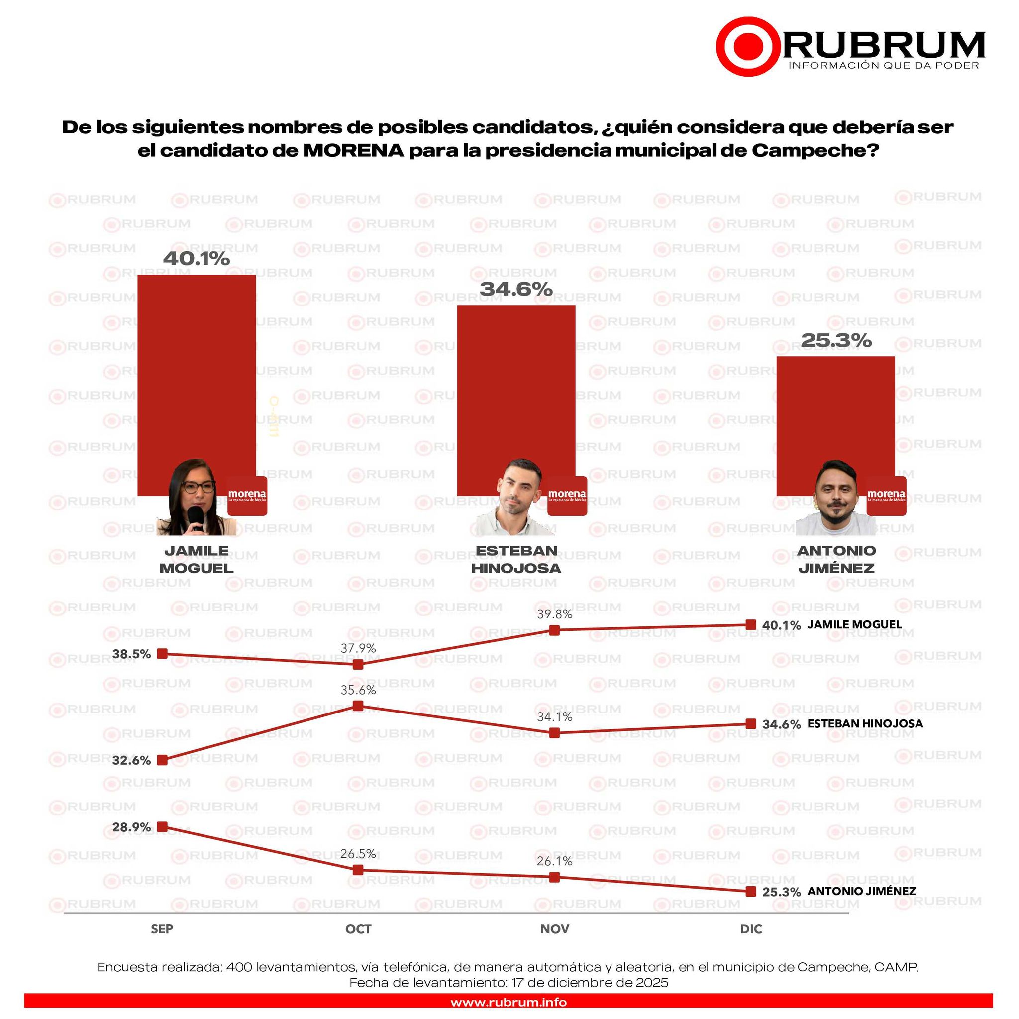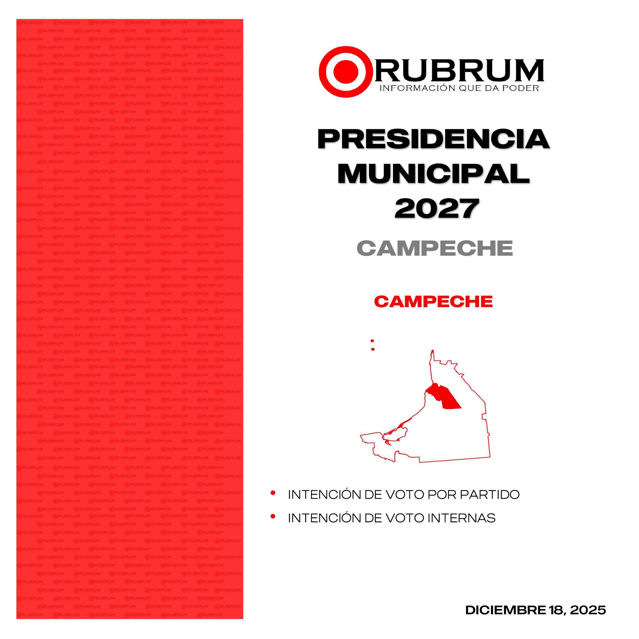 Encuesta de tendencias de los precandidatos a la alcaldía de Campeche rumbo al 2027-diciembre 2025. Metodología: Tipo de encuesta: Telefónica automatizada. Población muestra: Población muestra hombres/mujeres habitantes de la entidad municipal encuestada, mayores de 18 años. Tipo de muestra: Aleatorio representativo. Nivel de confianza: 95%. Margen de error: +/- 3.8%. Fecha de levantamiento: 17 de diciembre, 2025.