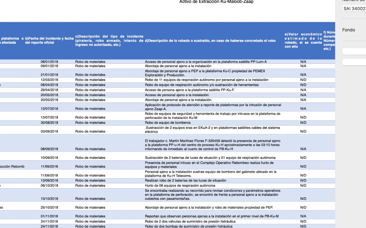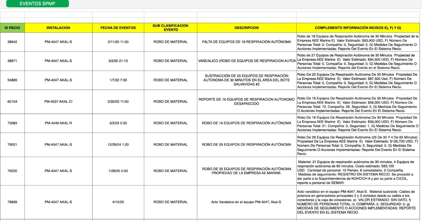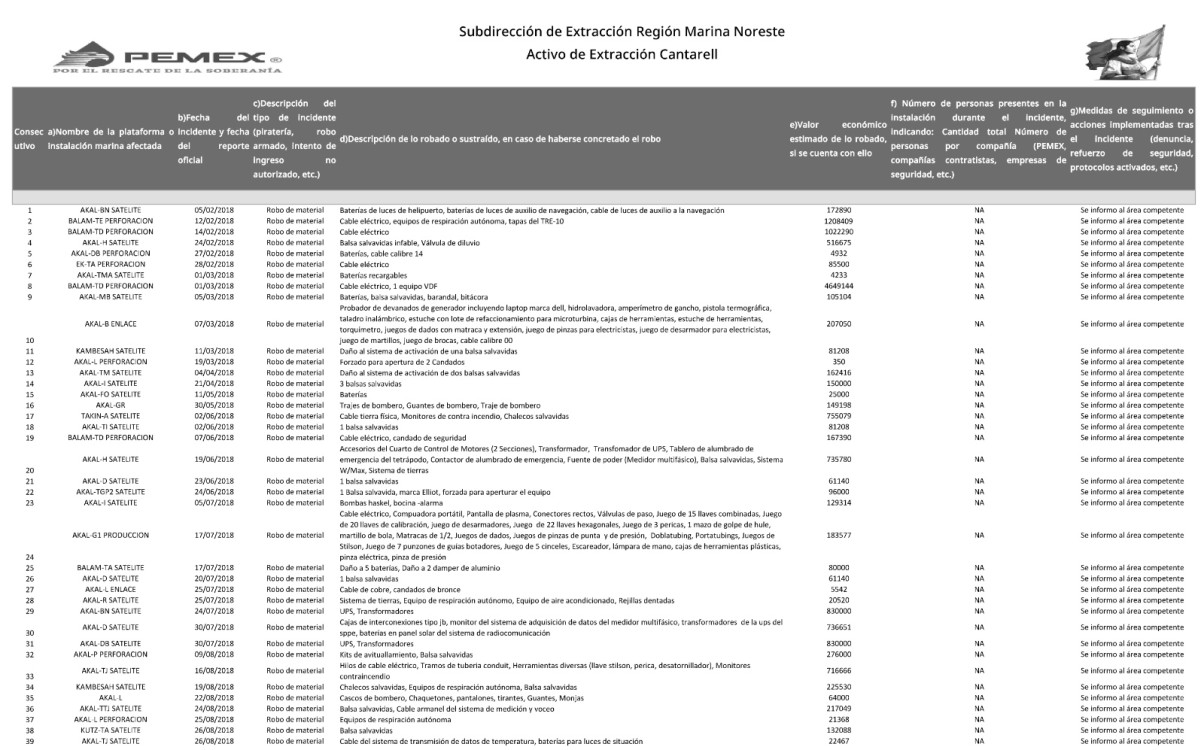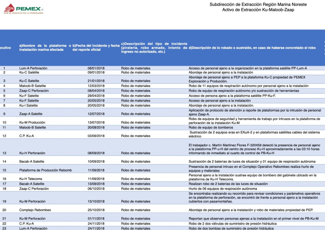 Para muestra un botón, el reporte señala que el 3 de octubre de 2018 en la plataforma Ku-M Perforación “se encontró de frente a personal ajeno a la instalación cubiertos con pasamontañas; y el del 17 de diciembre de 2018 en Zaap-B Satélite el reporte advierte atracos selectivos y coordinados para extraer materiales de valor técnico: “robo de cables Armanel y materiales diversos en CCM´s y (computadora, teléfono, cables, boquillas contra incendio, etc.)”.