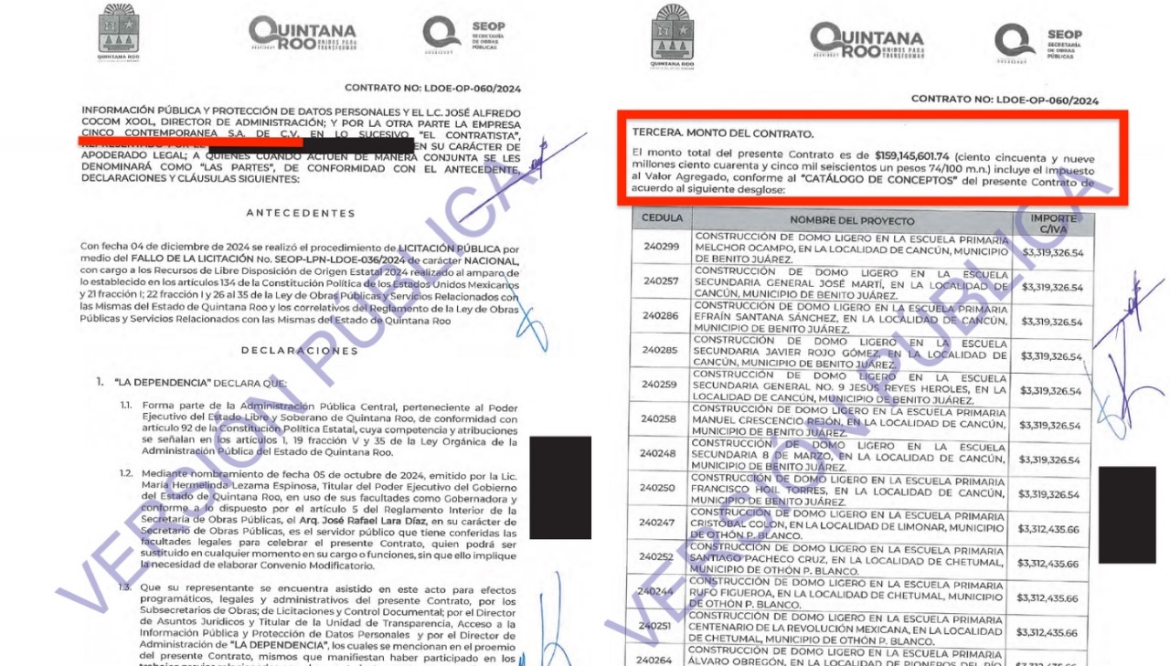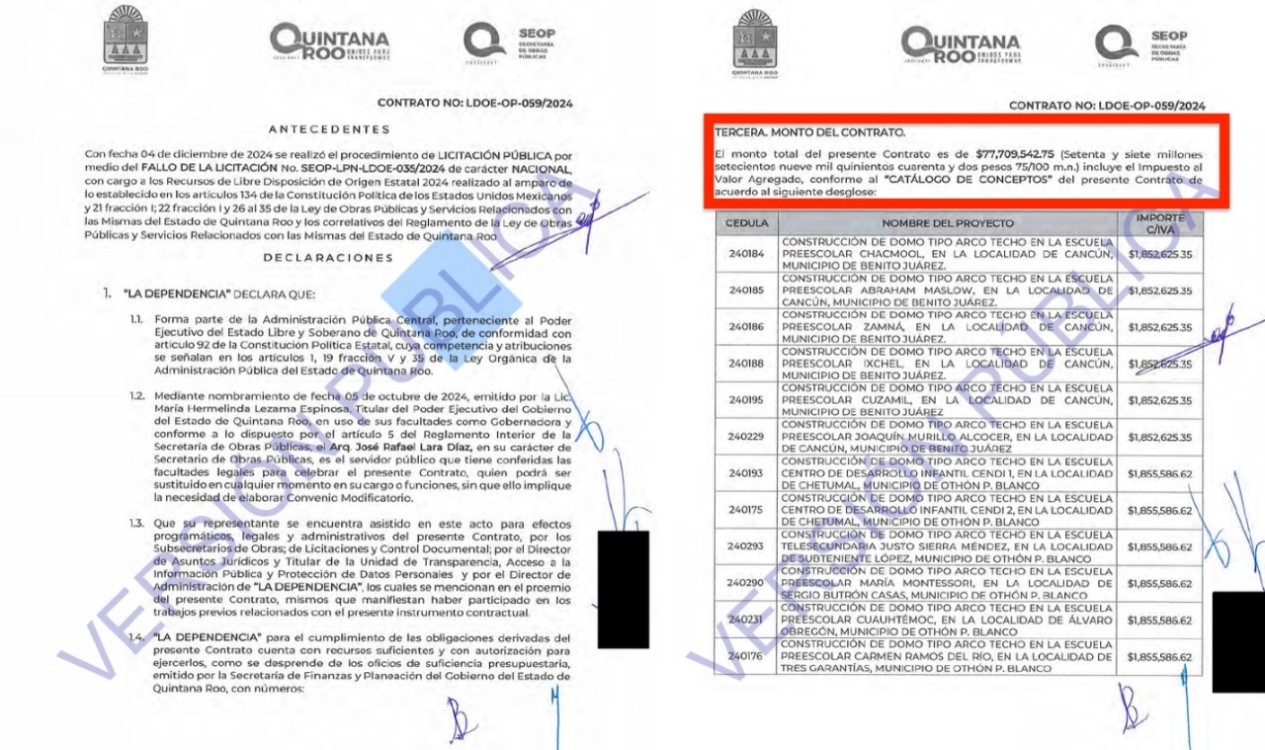 El otro contrato LDOE-OP-059/2024, fue a través de la licitación SEOP-LPN-LDOE-035/2024, y pese a que las mismas empresas mostraron interés en participar, solo la empresa de Guadalajara fue la única que presentó propuesta y a la postre resultó la ganadora para construir otros 42 domos: 10, en Benito Juárez; 14, en Othón P. Blanco; dos, Lázaro Cárdenas; dos, Bacalar; tres, Felipe Carrillo Puerto; seis, Solidaridad; y cinco en José María Morelos, por un monto $77,709,542.75 pesos.