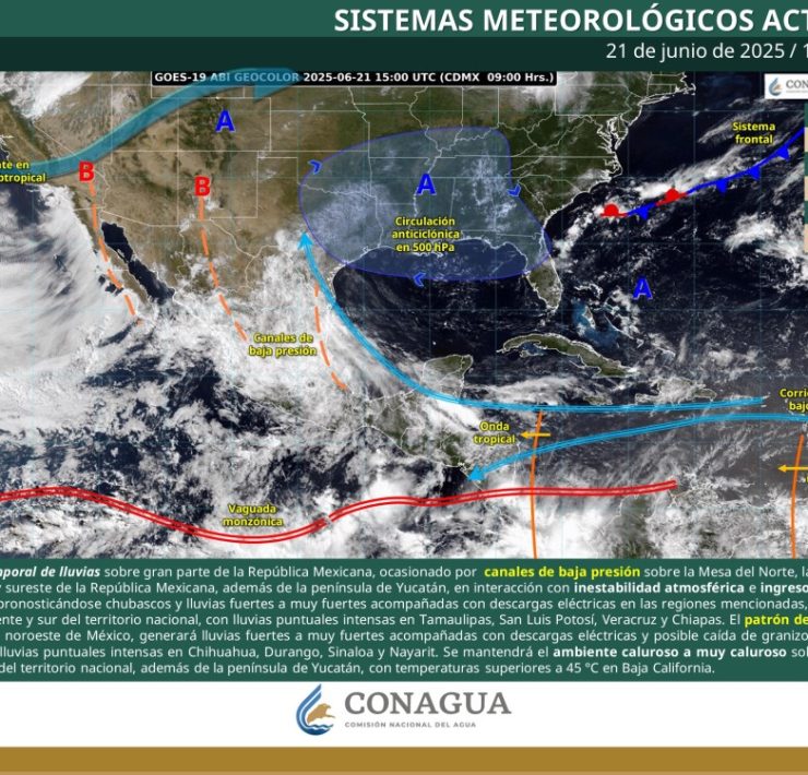 El desplazamiento de la onda tropical núm. 17, sobre el occidente del país, originará lluvias puntuales intensas con descargas eléctrica en Jalisco, Colima y Michoacán, y con posible caída de granizo en zonas altas de Jalisco. Se prevé que dicha onda continúe avanzando hacia el oeste y dejando de afectar al país al final del día. Otro canal de baja presión sobre Chiapas y Tabasco y la entrada de aire húmedo del mar Caribe, en interacción con la onda tropical núm. 18 que se desplazará sobre el sureste y sur del territorio nacional, propiciarán lluvias puntuales muy fuertes en Chiapas, Oaxaca y Veracruz; y puntuales fuertes en Quintana Roo, Yucatán, Campeche y Tabasco, todas acompañadas con descargas eléctricas. Finalmente, continuará el ambiente caluroso a muy caluroso por la tarde sobre entidades del norte del país, estados del litoral del Pacífico, litoral del golfo de México y península de Yucatán, así como ambiente extremadamente caluroso con temperaturas superiores a 45 °C en zonas de Baja California y Sonora, manteniéndose la onda de calor en zonas de Baja California, Baja California Sur, Sonora, Sinaloa, Colima y Michoacán.