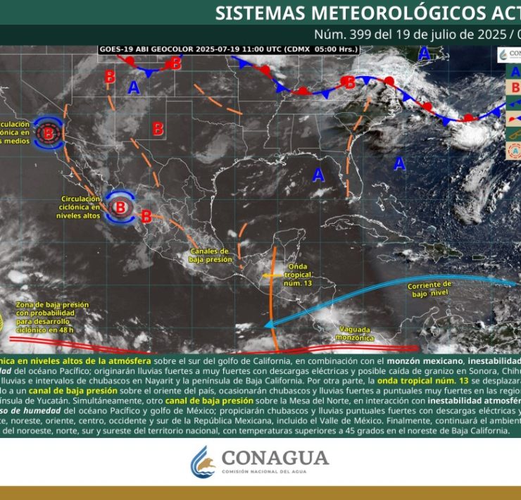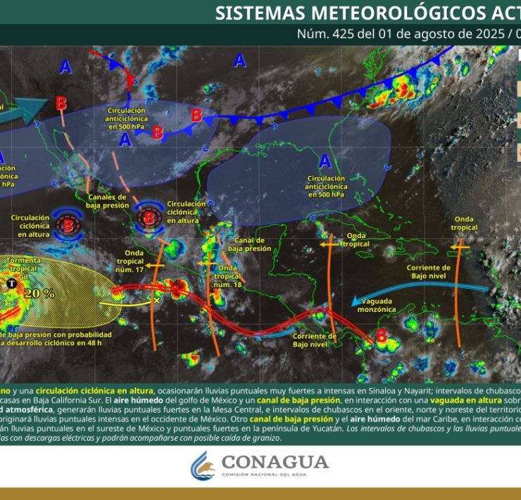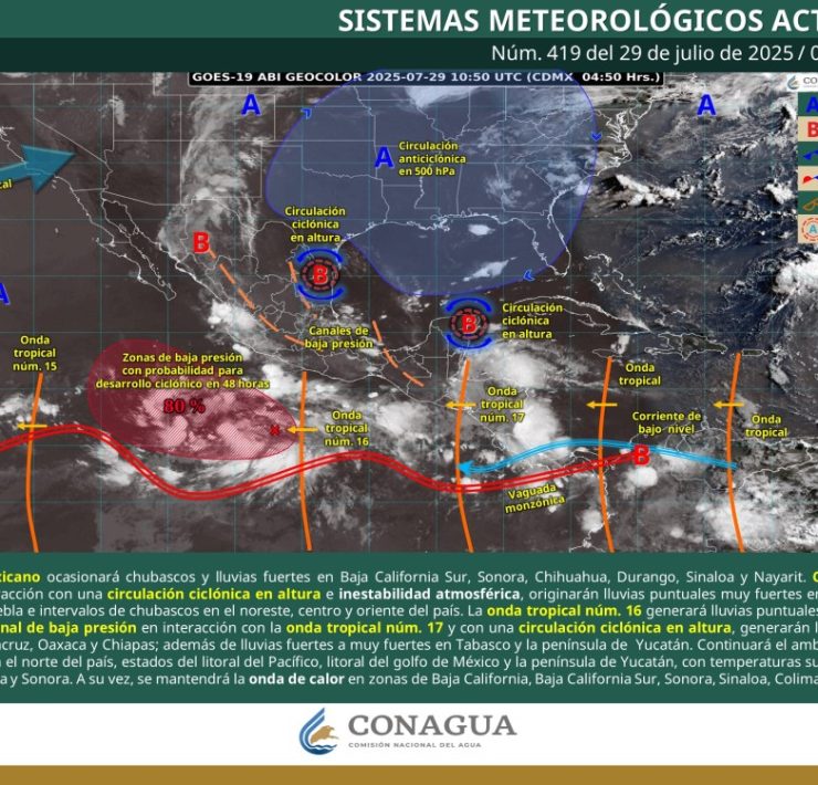 Este día, el monzón mexicano, una vaguada en niveles medios de la atmósfera sobre el noroeste del país e inestabilidad atmosférica, propiciarán chubascos y lluvias fuertes a muy fuertes en Baja California, Baja California Sur, Sonora, Chihuahua, Durango, Sinaloa y Nayarit. Por otra parte, un canal de baja presión sobre el interior de la República Mexicana, en combinación con una vaguada en altura y con el desplazamiento de la onda tropical núm. 27 sobre el occidente del territorio nacional, originarán chubascos y lluvias fuertes a muy fuertes en dicha región, además del noreste, centro, sur y oriente de México; con lluvias puntuales intensas en Guerrero. Simultáneamente, la onda tropical núm. 28 asociada con una zona de baja presión con probabilidad para desarrollo ciclónico, en interacción con otro canal de baja presión en el sureste mexicano; originarán lluvias fuertes a muy fuertes en la región mencionada y la península de Yucatán, con lluvias puntuales intensas en Oaxaca y Chiapas. Finalmente, prevalecerá el ambiente caluroso a muy caluroso sobre entidades del norte del territorio mexicano, estados del litoral del Pacífico y del golfo de México, además de la península de Yucatán; prevaleciendo la onda de calor en zonas de Jalisco (sur y suroeste), Colima (centro, este y sur), Michoacán (suroeste y sur), Guerrero (suroeste y sur), Coahuila (centro y norte), Nuevo León (sur), Tamaulipas (oeste y sur) y Oaxaca (sur).
