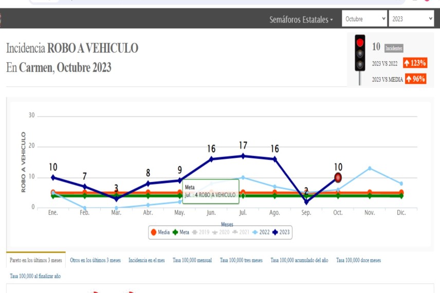 De acuerdo con la estadística de Semáforo Delictivo de Campeche que se aprecia en su página detalla que en el 2023, se registró un total de 98 robos a vehículo, en el mes de enero, se denunciaron 10 robo de vehículo ante la autoridad correspondientes; en el mes de febrero se denunciaron siete robos a vehículo; en el mes de marzo 3; en abril 8; en mayo 9; en junio 16; en julio 17; en agosto 16; en septiembre 2 y en octubre 10.