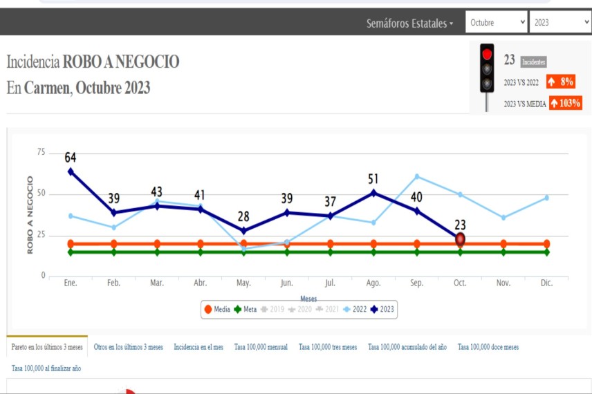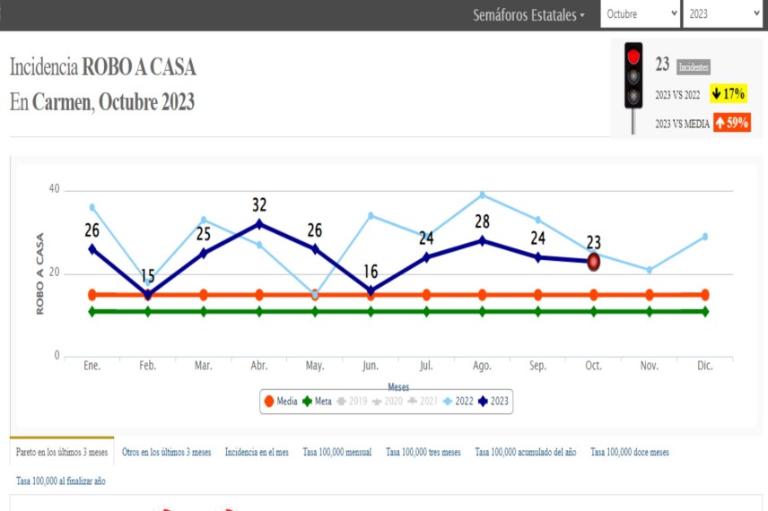 En el 2022, en enero se registró 37 robos a negocio, en febrero 30, en marzo 46, en abril 43, en mayo 17, en junio 21, en julio 37, en agosto 33 y en septiembre 61, y en octubre 50. Mientras que el robo a casa habitación de enero a octubre de este año en comparación al 2022 bajó en un 17%, al pasar de 288 a 239.