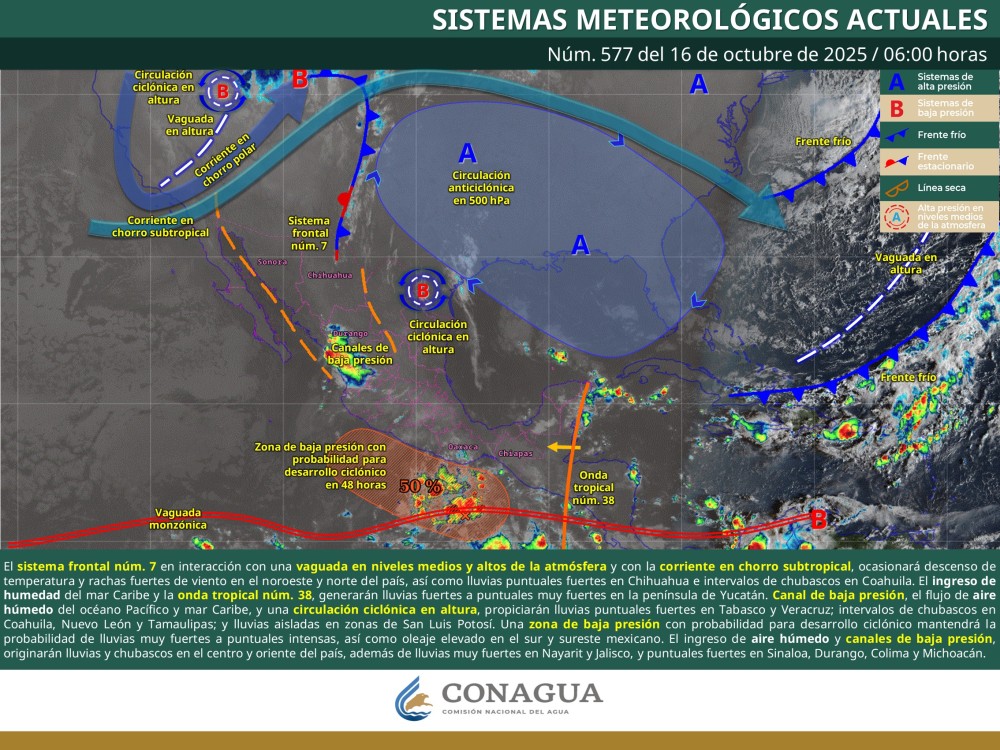 lo que ocasionará descenso de temperatura y rachas fuertes de viento en las región mencionada, además del noroeste mexicano, así como lluvias puntuales fuertes en Chihuahua; e intervalos de chubascos en Coahuila. Por su parte, el ingreso de humedad del mar Caribe y el avance lento de la onda tropical núm. 38, generarán lluvias puntuales muy fuertes en Quintana Roo y Yucatán;