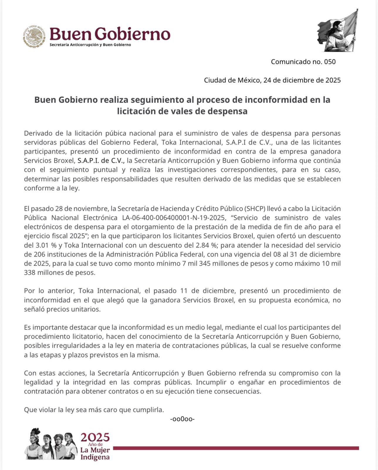 La Secretaría Anticorrupción y Buen Gobierno informó que se encuentra dando seguimiento a un procedimiento de inconformidad relacionado con la licitación nacional de vales electrónicos de despensa, un contrato cuyo monto puede superar los 10 mil millones de pesos.
