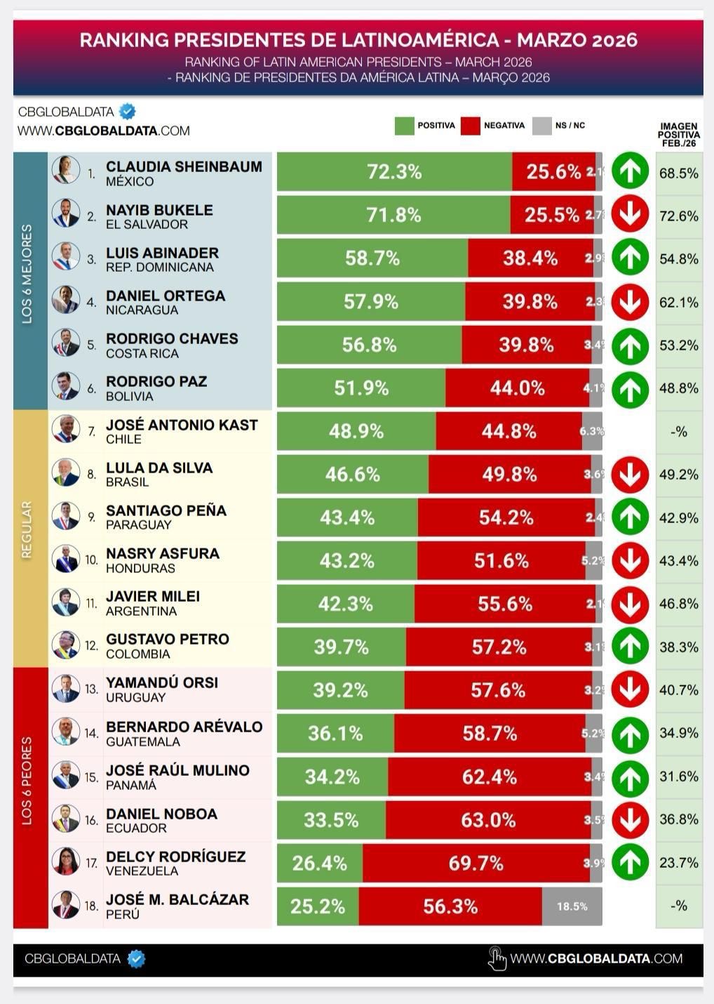 De acuerdo con mediciones recientes, la mandataria inició el primer trimestre de 2026 como la presidenta latinoamericana con mayor nivel de aprobación, alcanzando un 72.3%, por encima de líderes como  como Nayib Bukele y Luis Abinader. Este nivel de respaldo ciudadano se interpreta como un indicador clave de estabilidad política y aceptación de su agenda de gobierno.