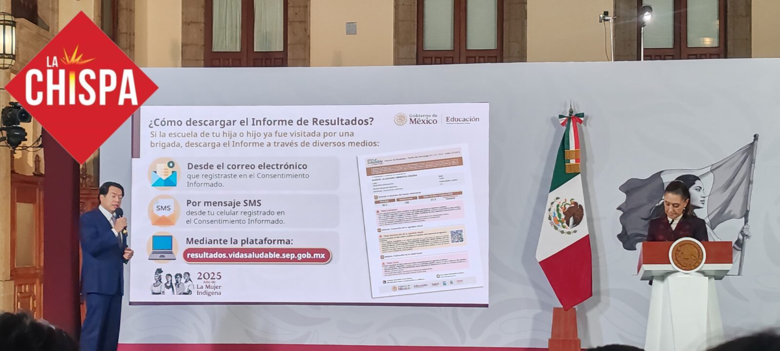 Sheinbaum pidió a madres y padres consultar los resultados enviados por correo electrónico, SMS o en el portal oficial, y acudir a los Centros de Salud para seguimiento, vacunación o la entrega de lentes gratuitos cuando sea necesario.