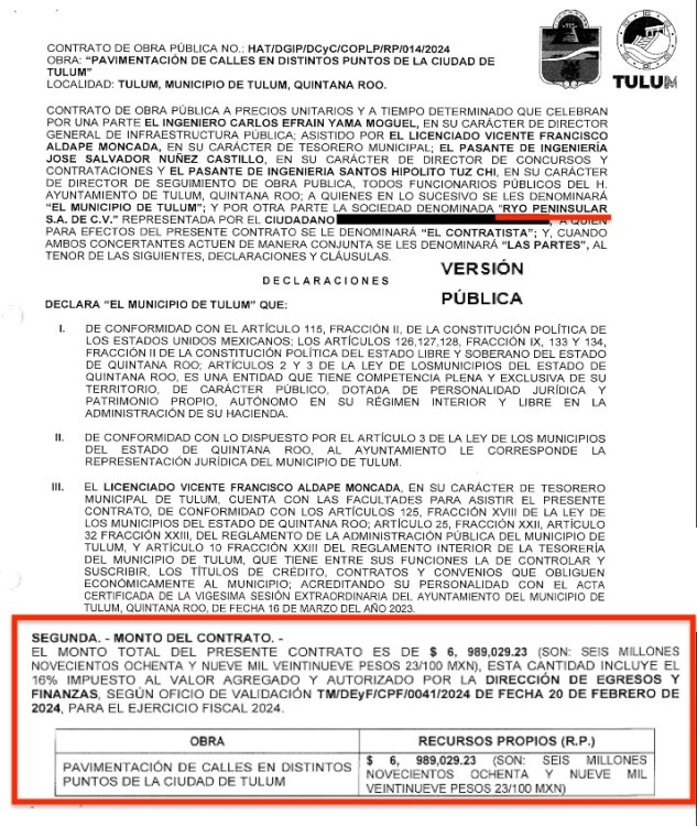 Por su parte la empresa RYO Peninsular SA de CV este año ya firmó otros tres contratos en Tulum: HAT/DGIP/DCyC/COPLP/RP/014/2024, por $6 millones 989 mil 29.23 pesos para la pavimentación de calles en distintos puntos de la ciudad; HAT/DGIP/DCyC/COP3P/RP/010/2024, por $2 millones 989 mil 483.04 pesos para la pavimentación en la Avenida La Selva, entre la Av. 5 y Av. 10 Norte; por último, HAT/DGIP/DCyC/COP3P/FAISMUN/005/2024, por $2 millones 987 mil 280.86 pesos para la construcción de parque público de la colonia Yaaxtulum.