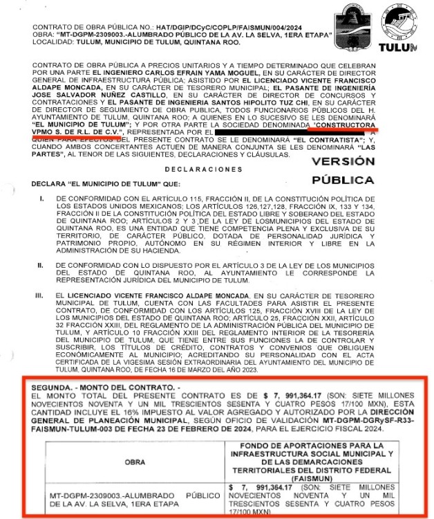 Sigue Constructora VPMO S de RL de CV que este año ya ganó los trabajos para alumbrado público en la Av. La Selva (Primera Etapa) por un monto de $7 millones 991 mil 364.17 pesos, según señala el contrato HAT/DGIP/DCyC/COPLP/FAISMUN/004/2024.