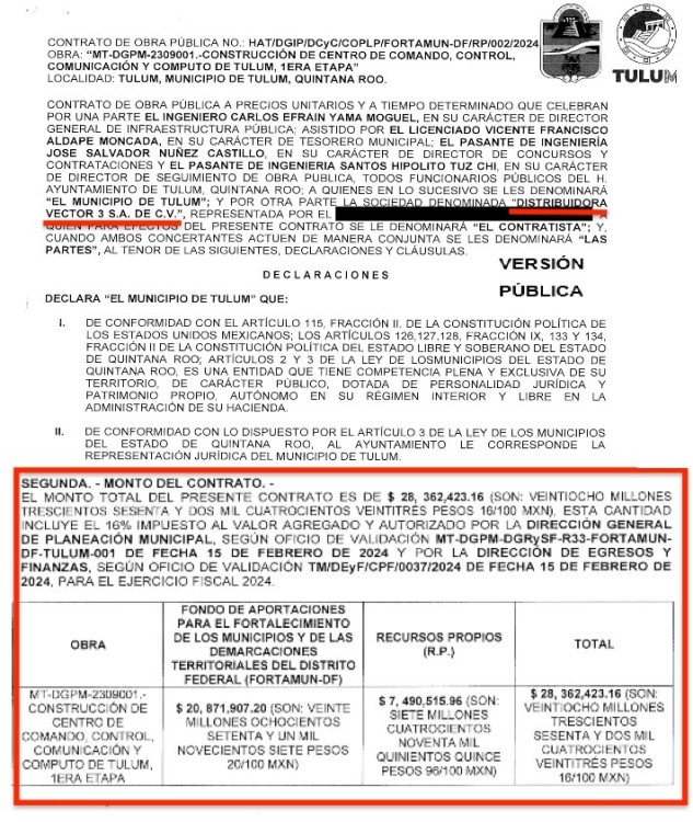 En 2024, Distribuidora Vector 3 SA de CV firmó el pasado 15 de marzo, el contrato identificado como HAT/DGIP/DCyC/COPLP/FORTAMUN-DF/RP/002/2024 para la construcción de Centro de Comando , Control, Comunicación y Cómputo (C-4) de Tulum (Primera Etapa) por un monto de $28 millones 362 mil 423.16 pesos.