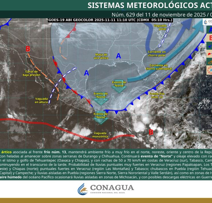 El Servicio Meteorológico Nacional (SMN), prevé que, la onda tropical Núm. 27 se desplazará sobre el sureste y sur del territorio nacional, posteriormente interaccionará con un canal de baja presión que se localizará al suroeste del Golfo de México, propiciando lluvias puntuales intensas en Oaxaca, Chiapas, Veracruz, Tabasco, Campeche, Yucatán y Quintana Roo.