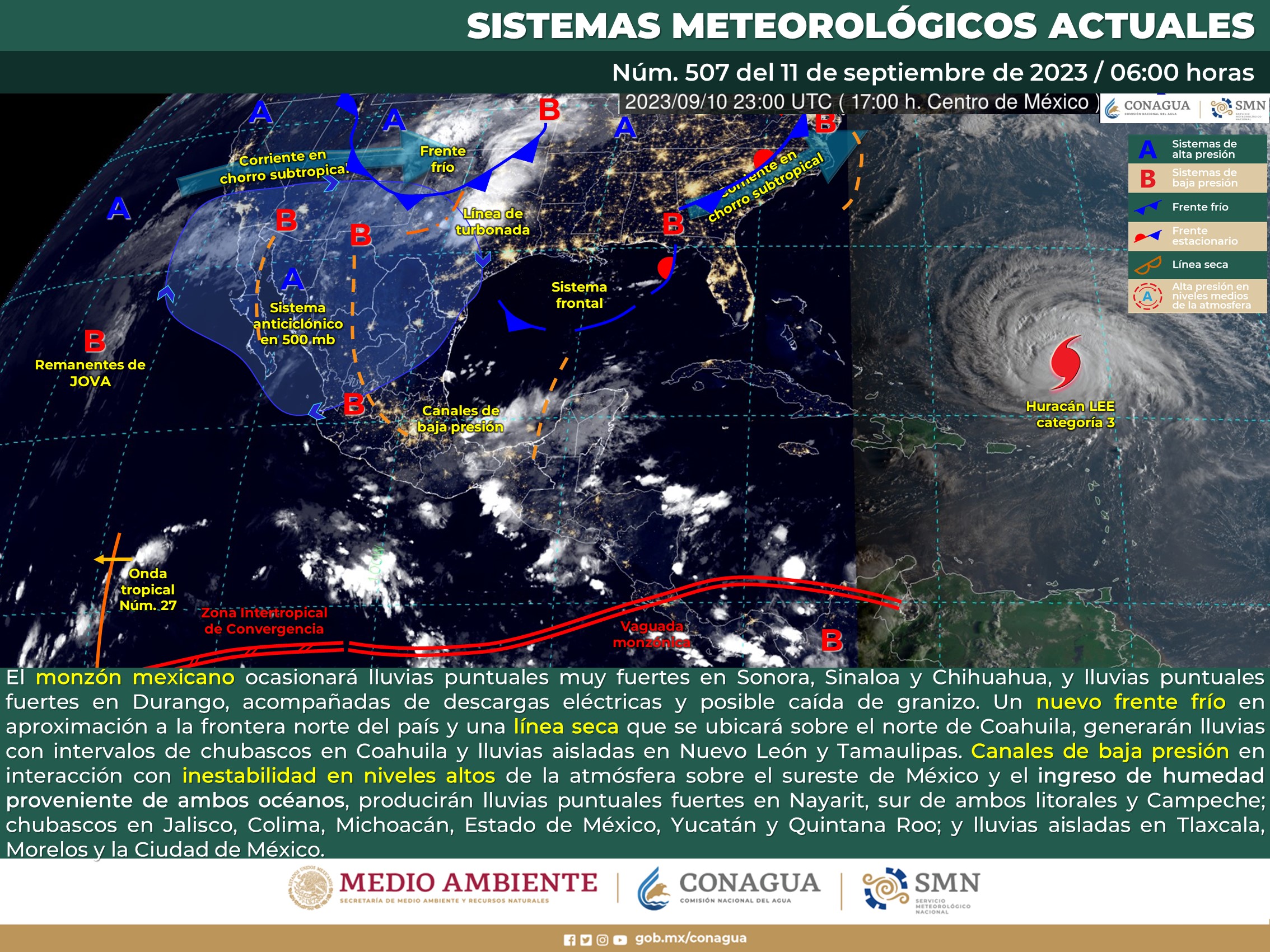 El Servicio Meteorológico Nacional (SMN) prevé que para este día, continuara el monzón mexicano sobre el noroeste de México, así como canales de baja presión que prevalecerán sobre el centro y sureste mexicano, aunado al ingreso de humedad de ambos litorales y el nuevo frente frío Núm. 2 sobre la frontera norte del territorio nacional, producirán lluvias muy fuertes en Chihuahua, Tabasco y Chiapas; lluvias fuertes en Sonora, Sinaloa, Nayarit, Durango, Veracruz, Oaxaca y Campeche; asimismo, lluvias y chubascos en el noroeste, norte, noreste, occidente, centro y sur del país, así como en la Península de Yucatán.