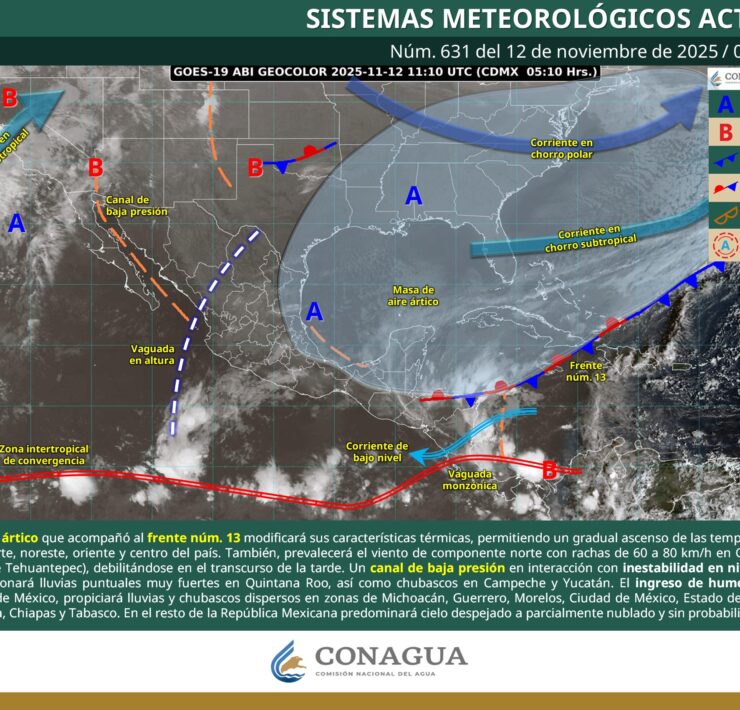 El Servicio Meteorológico Nacional SMN) prevé que este día, el frente frío Núm. 9 recorrerá el norte de la República Mexicana e interaccionará con la corriente en chorro subtropical en niveles altos de la atmósfera y en superficie con un canal de baja presión sobre el noreste del país, lo cual producirá lluvias puntuales muy fuertes en Coahuila, Nuevo León y Tamaulipas; fuertes en Chihuahua y Durango, así como chubascos en Zacatecas y San Luis Potosí.