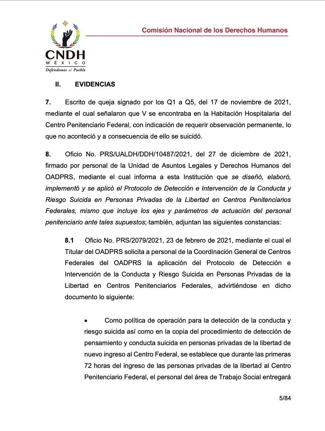 La víctima de identidad resguardada, fue valorada en múltiples oportunidades por el personal médico del penal federal, quienes en sus notas de atención psicológica indicaron que el paciente requería de observación permanente en el área hospitalaria, según al expediente CNDH/3/2021/10997/Q.