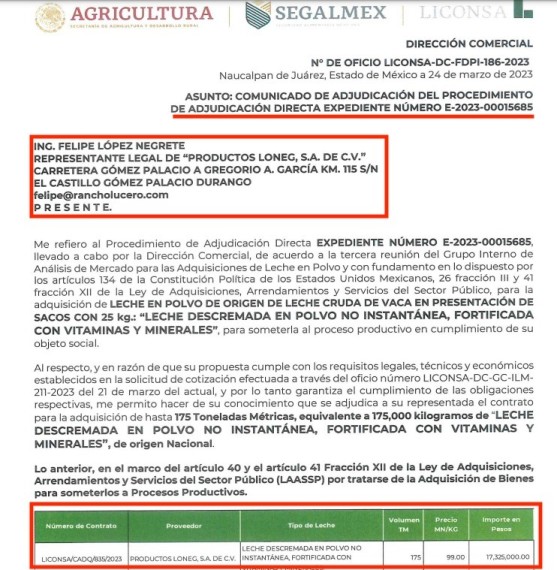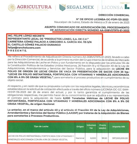 Pero no es el único contrato obtenido este año, pues a través del oficio LICONSA-DC-FDPI-121-2023, fechado el 31 de enero, se le adjudica el contrato para la adquisición de hasta 6.000 toneladas métricas de leche en polvo instantánea, fortificada con vitaminas y minerales y adicionada con 8% a 9% de grasa vegetal por un monto de 597 millones de pesos.