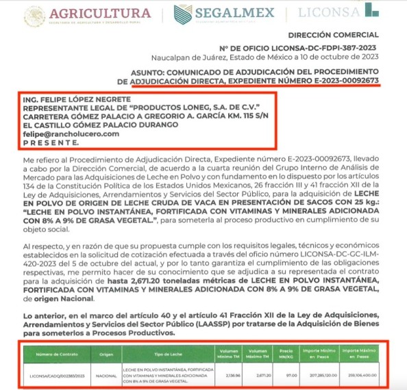 El más reciente fue apenas el pasado 10 de octubre cuando por adjudicación directa, Liconsa le asignó a Productos Loneg el contrato para la adquisición de hasta 2,671.20 toneladas métricas de leche en polvo por un monto de 259 millones 106 mil 400 pesos, tal y como se describe en el oficio LICONSA-DC-FDPI-387-2023.