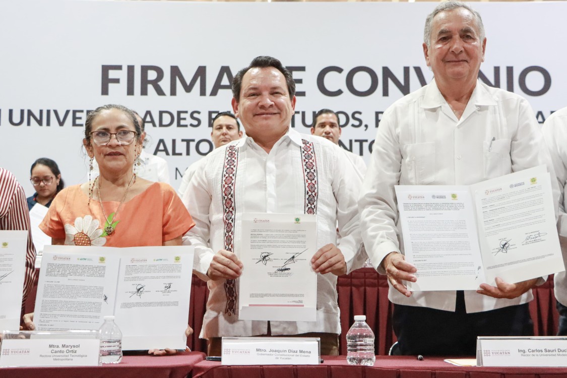 Acompañaron al Gobernador durante esta firma de convenio, el director general del IDEY, Armín Lizama Córdoba; la rectora de la Universidad Tecnológica de Mérida, Marysol Canto Ortiz; el rector de la Universidad Modelo, Carlos Sauri Duch así como representantes de las instituciones de educación superior que forman parte de este convenio.