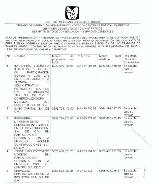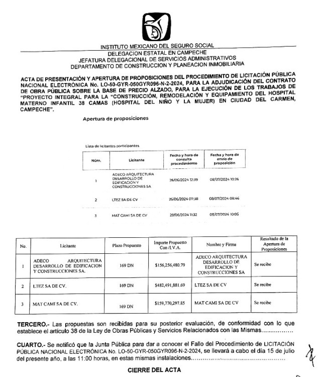 En estos días, el IMSS prepara la adjudicación de las licitaciones LO-50-GYR-050GYR096-N-2-2024 y LO-50-GYR-050GYR972-N-8-2024 para la ejecución de los trabajos de “proyecto integral para la “construcción, remodelación equipamiento del hospital materno infantil 38 camas (hospital del niño y la mujer) en Ciudad del Carmen, Campeche.