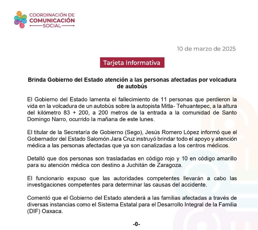 El gobernador Salomón Jara envió sus condolencias a las familias de las víctimas y aseguró que su administración proporcionará apoyo total a los afectados. “Con profundo pesar, informo que en el accidente ocurrido en la carretera Mitla-Tehuantepec, se registran personas fallecidas. Envió mi más sentido pésame a sus familias, a quienes les brindaremos el acompañamiento y apoyo necesarios”, declaró el mandatario.