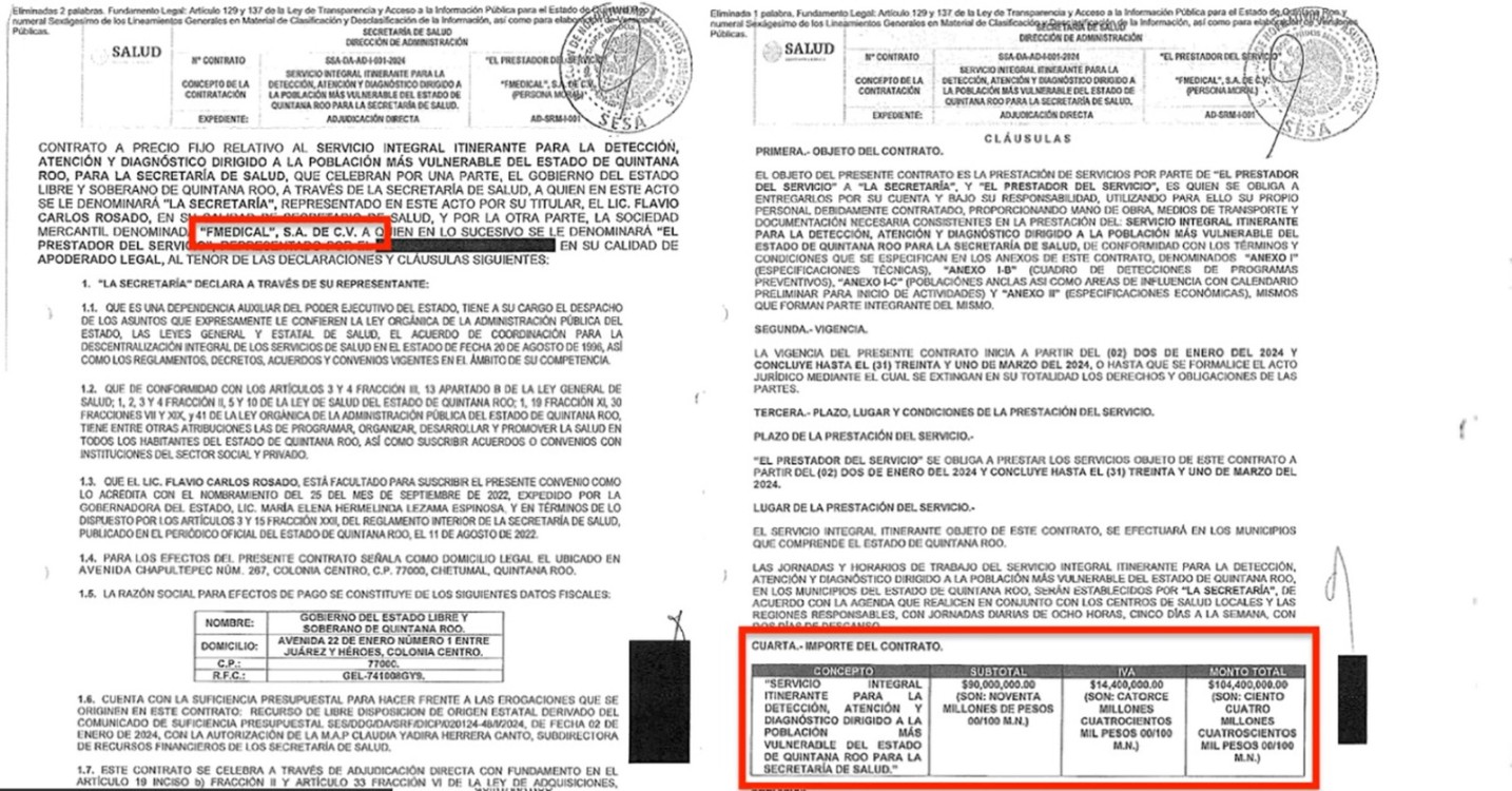 FMEDICAL ha sido uno de los proveedores más recurrentes en la Secretaria de Salud de Quintana Roo, pues durante la administración anterior del panista Carlos Joaquín, obtuvo contratos por 200 millones de pesos, entre ellos, el SESA-DA-AD-018-2022, por $56,250,000 pesos, el SESA-DA-AD-099-2020, por $37,500,000 pesos, el SESA-DA-AD-047-2021, por $68,750,000 pesos y el SESA-DA-AD-086-2020, por un monto de $25,000,000, entre otros, todos por el servicio integral de atención médica en unidades móviles; es decir, Mara Lezama, no solo le dio continuidad al programa, sino también al proveedor consentido del sexenio pasado.